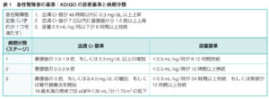 | AKI診断基準 | ①血清Creの急激な上昇 ・48時間以内に血清Cre値が0.3mg/dL以上上昇した場合 ・血清Creが7日以内の基礎値より1.5倍以上の増加があった場合 ※以前の血清Creを確認し、変化なければCKDと判断する ②急激な尿量減少(CKDではCr上昇があっても尿量が保たれる) ・尿量0.5mL/kg/hr未満が6時間以上持続している場合 ![]() |