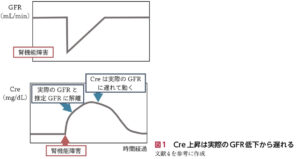 | 病態 | 腎前性、腎性、腎後性が原因で、急激に腎機能が低下する臨床症候群。基本的に可逆的であり、一部は慢性に進行する。ショックでは血液の再分配により、皮膚・消化管・腎臓の血流が減少する。そのため、尿量低下は臓器循環不全の最初の徴候となりうる。 ※尿が急激に低下しても、Cre値やeGFRは遅れて低下する点に注意! ![]() |