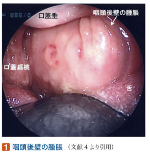 | 所見 | 視診:咽頭後壁の腫脹、斜頸 触診:圧痛を伴う頸部腫脹 |