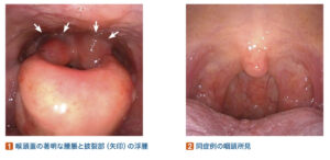 | 診断 | 喉頭内視鏡で喉頭蓋の発赤・腫脹を確認![]() |