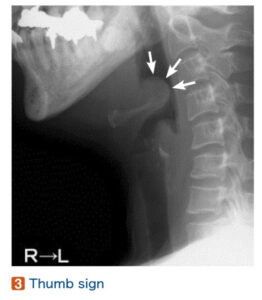 | 検査 | 【血液検査】 白血球数・CRPの上昇を認めることが多い 【画像検査】 喉頭高圧X線側面像:thumb sign うつ伏せで頸部造影CT:矢状断像で腫大した喉頭蓋(vallecula sign、thumb sign) |