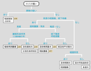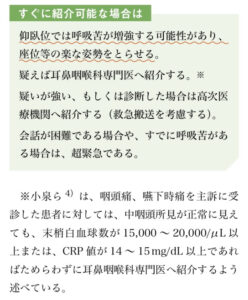 | 帰宅 | 急性喉頭蓋炎や扁桃周囲膿瘍は、数日の咽頭痛の後、急激に増悪する経過を取る。 患者や家族には、呼吸苦の出現 or 4〜5日以上発熱が続く場合は再診するよう指示する。 |
