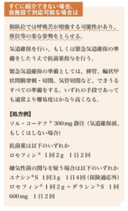 | 治療 | ![]() ①気道緊急が疑われる場合、気管挿管(緊急時は外科的気道確保) ②第3世代セフェム系点滴静注 例:CTRX2g/日 7〜10日間 例:CEZ1g/日 7〜10日間 ③ステロイド点滴静注 例:メチルプレドニゾロン(ソルメドロール®)1mg/kg+生食100mL ![]() |