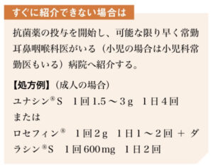 | 治療 | ①切開・排膿が原則となるため、耳鼻咽喉科医(小児の場合は小児科医)のいる病院へ紹介する。 ②すぐに紹介ができない場合 ![]() |
