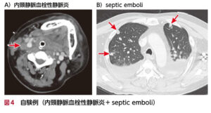 | 検査 | 血液検査:炎症反応高値 頸部造影CT:内頸静脈内に血栓が造影不良域として描出 胸部CT:敗血症性肺塞栓症(両側びまん性すりガラス影、胸膜に接する楔形陰影など) ![]() |