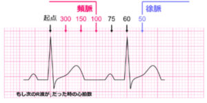 | ②心拍数は? | RR間隔:3〜6マス(100〜50回/分)なら正常 ※太い目盛=5mm(0.2秒)にR波が1つなら心拍数は60÷0.2=300回/分 ![]() |