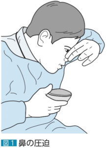 方法 坐位で下方へ顔を向け、鼻根部の柔らかい軟骨を15分程度圧迫