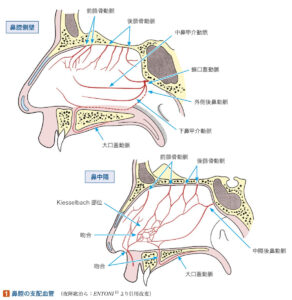 部位 ※キーゼルバッハ部位:内頸A由来の篩骨A、外頸A由来の顎A・口蓋A上唇Aが吻合する鼻中隔の部位