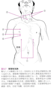 | ショック+頸静脈怒張+患側胸郭膨隆+皮下気腫+呼吸音減弱 | 緊張性気胸 |