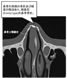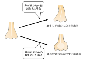 | 分類 | ①斜鼻型(lateral type):鼻が横から外傷を受け、鼻すじが斜めに曲がる ②鞍鼻型(frontal type):鼻が正面から外傷を受け、鼻の付け根が陥没する ![]() |