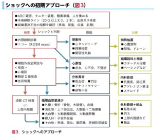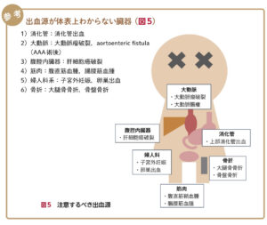 | 循環血漿量減少性 | 出血源を精査しながら、輸血の準備 ①胸腹部造影CT:消化管出血、A解離、骨折など ②直腸診:消化管出血 ![]() |