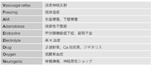 ①心筋梗塞②弁膜症③不整脈などの心収縮力低下 | ①心タンポ②緊張性気胸③肺塞栓症による右心拡張障害 |