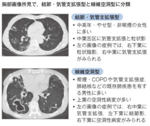 | 検査 | 【喀痰検査】 ①Ziehl-Neelsen染色陽性・喀痰培養:2回(初診なら結核を疑い3回)実施 ②PCRでNTM検出(確定診断) 【血液検査】 抗MAC抗体:M .kansasiiを除くNMTで陽性(補助診断)、病変が軽度なら偽陰性 ※ほとんどのNTMでIGRAは陰性 【画像検査】→病型を分類 胸部Xp:両中下肺野の粒状影や結節影 胸部CT:中葉舌区を主体とした小葉中心性粒状影+気管支拡張像(末梢で胸膜肥厚を伴う)、比較的壁の薄い空洞影を伴うことが多い ※線維空洞型の方が治療反応性は不良で予後が悪い |