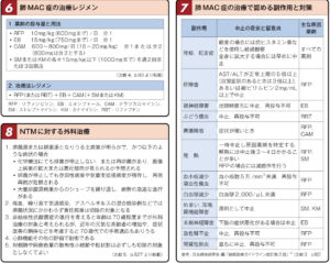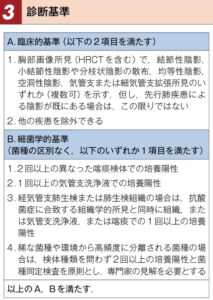 | 治療 | 多剤併用療法(アジスロマイシン+リファンピシン+エタンブトール) 治療期間は排菌が陰性化した後、1年~1年半は薬剤継続する ※現行の薬物療法を行なっても完治は難しい |