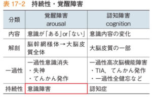 | ●認知障害(意識変容):大脳皮質の一部が障害され、言語などのその部位の対応した認知障害が生じる 見当識障害:日時・場所・人がわからない状態(JCS 2) ※生年月日・自分の名前・住所は見当識ではなく記憶力(JCS 3) せん妄:覚醒障害と認知障害どちらも生じる |