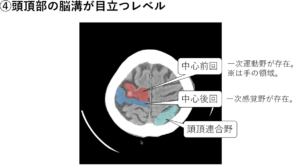 | ①頭頂部レベル | 中心前回の逆Ωサイン(手の運動領域)、中心前回の背側に位置する中心溝は前頭葉と頭頂葉の境界![]() |