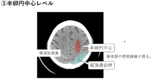 | ③放線冠レベル | 側脳室が蝶形、側脳室の外側に放線冠(錐体路や感覚線維の通路)![]() |