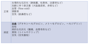 | T2*強調 | 異常鉄沈着、石灰化、出血 | T2強調と比べて、磁性体をより明瞭に低信号として捉えて描出するという特徴があるため、ヘモジデリンや出血が低信号となる(画像の特徴はT2と比較すると鼻腔がアーファクトで見にくい)![]() |