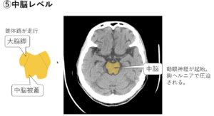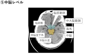 | ⑤中脳レベル | ミッキー中脳(耳=大脳脚は錐体路)、中脳の外側にニッコリマークの側脳室下角&背側の海馬、ヒトデ型(ペンタゴン)の脳底槽![]() ![]() |