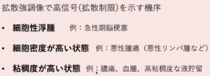 | 拡散強調 (DWI) | 細胞浮腫 細胞密集 |