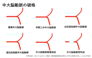 | 中大脳動脈 | 【正常変異】 2本の場合もある(早期二分中大脳動脈が最多)。窓形成をする場合もある。 ![]() ![]() |