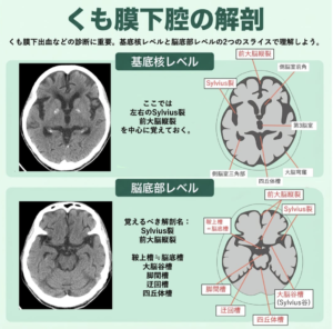 | くも膜下腔 | くも膜下腔は①大脳基底レベル→②脳底槽レベルの2つを確認 ●高吸収域あり:くも膜下出血の疑い |