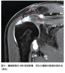 | 病態 | 腱板に亀裂が入る疾患。多くの場合は棘上筋腱から断裂が始まり、腹側や背側に伸長する。外傷による損傷よりも加齢に伴う退行性変化が圧倒的に多く、80歳代では50%に認める。腱板断裂すると腱が自然修復することはなく、手術による修復を行うほかない。 |