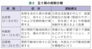 | 治療 | 介入しなくても発症から約2年で自然治癒するが、介入により短くできる可能性あり 薬物療法:鎮痛薬、温熱療法 運動療法:病期に合わせた対応、可能な範囲で適度な運動を行い拘縮予防に努める |