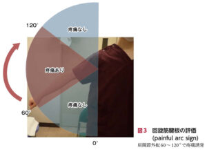 症状 運動時痛、安静時、夜間痛:肩関節外転時に肩峰と腱板が衝突するため=インピンジメント