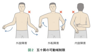 | 所見 | 視診:進行すると棘上筋や棘下筋が萎縮(五十肩では見られない) 触診:棘上筋断裂部の触知、他動的な可動域制限を認めない |