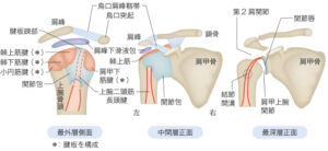 肩関節は5つの骨(上腕骨、肩甲骨、鎖骨、胸骨、肋骨)から構成され、烏口肩峰靭帯が形成するアーチの下には腱板と肩峰下滑液包がある(肩関節の周囲は腱板が覆っている)。