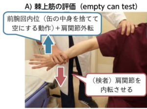方法 肩関節を外転させ、60〜120度で疼痛が誘発されたら陽性。まず自動運動を確認し、その後他動的に確認する。上腕骨骨頭と肩峰との間に回旋筋腱板や肩峰下滑液包が挟み込まれて疼痛が生じる。