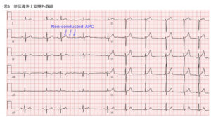 | 分類 | ①一般的なAPC:変形P波+Narrow QRS ②心室内変行伝導を伴うAPC:T波と重なる変形P波+Wide QRS+陰性T波(先行する洞調律の右脚や左脚の不応期が残っている時にAPCが起こると、伝導が心室に入ると心室伝導は遷延し多くは右脚ブロック様のWide QRSとなる)③非伝導性APC:変形P波+QRS欠如(先行する洞調律のQRS不応期が残っている時にAPCが起こったため変形P波のみ出現する。PP間隔が突然延長していたら直前のT波に変形P波が重なっていないか目を凝らすこと) ![]() |