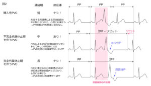 | 分類 | ①間入性PVC:洞調律に影響を与えないもの ②代償休止期を伴うPVC:PVCの出現により次の洞調律が遅れるもの ![]() |
