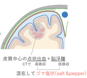 | 検査 | 頭部CT:時間経過とともに冠状断像でごま塩状の変化が見られることがある![]() |