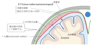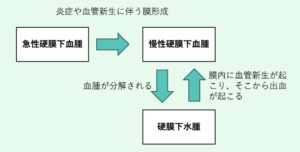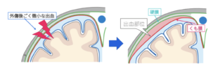 | 病態 | 軽微な頭部外傷による微量の出血が生じ、硬膜下に被膜を伴う血腫が徐々に拡大する病態。アルコール多飲者や高齢者に多く(脳萎縮?)、受傷後3週間〜6ヶ月で発症する。![]() |