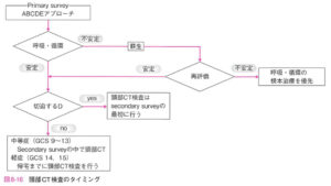 | ②循環管理 | sBP:110mmHg以上、MAP:90mmHg以上、脳灌流圧:50mmHg以上、Hb 10g/dL以上 |