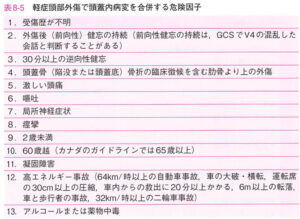 | ① | 軽症なら危険因子を確認し、該当すれば頭部CTは必須。GCS15でも一過性の意識消失や健忘がある場合、頭部CTが推奨されている。![]() |
