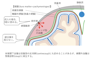 | 病態 | 頭部外傷により脳表の静脈(複合型)>架橋V(単純型)が破綻し、硬膜下に血腫が生じた病態。乳幼児では強く頭を揺さぶられて架橋Vが破綻するshaken baby syndromeがある。![]() ![]() |
