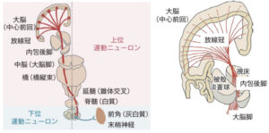| 上位運動ニューロン | 大脳皮質中心前回→放線冠→内包後脚→大脳脚→橋→延髄→側索 |
