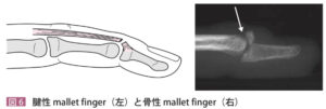 | 病態 | 指を伸ばした状態でボールなどがぶつかりDIPの伸筋腱が断裂する。指の腱損傷は末節骨の剥離骨折を伴う場合がある(骨性Mallet finger)。![]() |