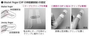 | 治療 | 固定後、伸展装具着用して帰宅。6週間程度、DIP関節を伸展保持する。 ①冷却:湿布は使用せず、タオルの上からじんわりと冷やす ②挙上:患肢の下に枕など入れて高くする ③疼痛:アセトアミノフェンなど |