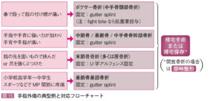 | 固定 | ①Gutter splint固定(第2・3中手骨骨折はulnar)![]() |