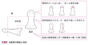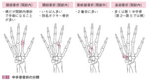 | 病態 | ボクシングや転倒で握り拳の状態で中手骨の先端部から根元に向かって強い力が加わることで生じる骨折。解剖学的に頚部>骨幹部>>>頭部・基部の骨折に分類される。![]() |