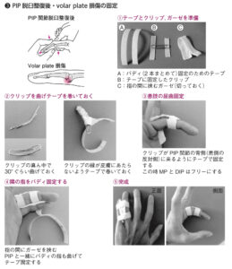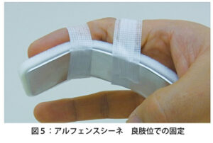 | 固定 | ①Gutter splint固定:中手骨骨折を参照 ②バディ固定:中節骨骨折で転位が小さい場合 ③アルフェンスシーネ固定 ![]() |