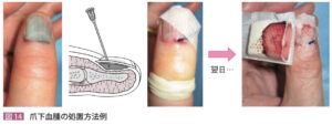 | 合併 | ![]() ①爪床裂創:洗浄してサージカルテープで爪がずれないように固定する ②爪下血腫:血腫が爪の50%以上なら18G針で穴をあけてドレナージ(貫通穴に4-0ナイロン糸を2〜3本入れてからハイドロサイト®などで被覆すると、毛細管現象で糸が血腫をハイドロサイト®へ吸い上げ翌日には血腫はほぼ綺麗に除去されている) ![]() |