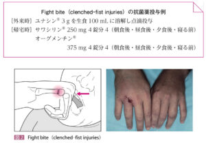 | 合併 | ●Fight biteの合併症を確認 顔面を殴った際に拳が歯にあたり裂創を伴うことで、門歯が手背を貫通して伸筋腱断裂となったり、傷口から細菌が入り腱鞘炎や骨髄炎となることがある。 ①十分に傷口を洗浄+異物除去 ②抗菌薬の点滴+帰宅後の内服 ![]() |