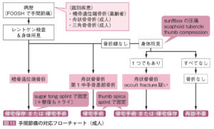 | 検査 | 【身体所見】 ①Snuffboxの圧痛、②Scaphoid tubercle、③Thumb compressionを評価し、1つでも所見がある場合は舟状骨骨折疑いで固定を行う 【画像検査】Xp:手関節2方向で撮像し骨折線を探す CT:Xpで骨折線があれば評価のため撮像し整形外科に見せる MRI:Xpで骨折がはっきりしない場合に検討 |
