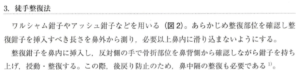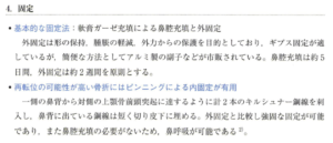| 治療 | 鼻の変形がある場合、受傷後1〜2週間で癒合してしまうため早期の整復が必要 【受傷後3時間以内】 腫脹がひどくない場合が多く、整復が可能。アドレナリン入りリドカイン液を浸潤させた小ガーゼで鼻内表面麻酔(小児は全身麻酔)→鼻骨整復鉗子(ワルシャム鉗子など)を鼻に入れて整復→数日間の鼻内パッキングガーゼ挿入と1〜2週間のギブス固定(非観血的整復) 【3時間以上経過】 腫脹がひどくことが多く、鉗子が鼻に入らず治療できない。基本的に命に関わる骨折ではないので数日後に再評価し、受傷後5〜10日で鉗子により整復することが多い(非観血的整復)。整復出来ない場合や放置して変形治癒した場合は観血的整復を検討する。 |