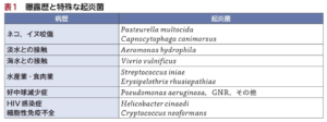 | 曝露歴 | 職業歴、動物との接触、淡水海水曝露など必ず確認し、該当すれば特殊な起因菌を疑う![]() |